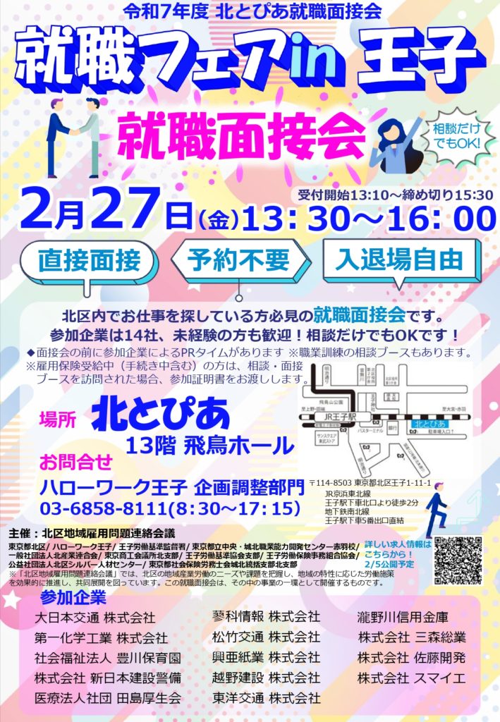 第2回 北とぴあ就職面接会 転職フェアin王子 参加予定! 2026年1月21日 最終更新日時 : 2026年2月10日 sysadmin 「第2回 北とぴあ就職面接会 転職フェアin王子」 へ参加予定! 開催日時:令和8年2月27日 13:30~16:00 開催場所:北とぴあ 13階 飛鳥ホール 北区王子1-11-1
